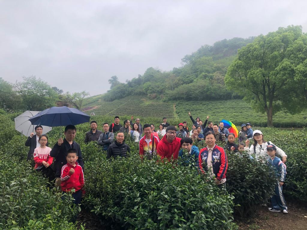 当日一早,老师们先来到海盐县丰义村。一进村庄,高耸挺拔的路边水杉,绿树掩映的农家小院,还有郁郁葱葱的远处青山,一个山清水秀、整洁干净的美丽新农村跃然映入眼帘,这里已经完全没有了十几年前老矿区的痕迹。走在绿意盎然的茶园中,一排排的茶树整齐划一,空气中飘散着淡淡的茶叶清香,老师悠闲的体验着农耕生活。