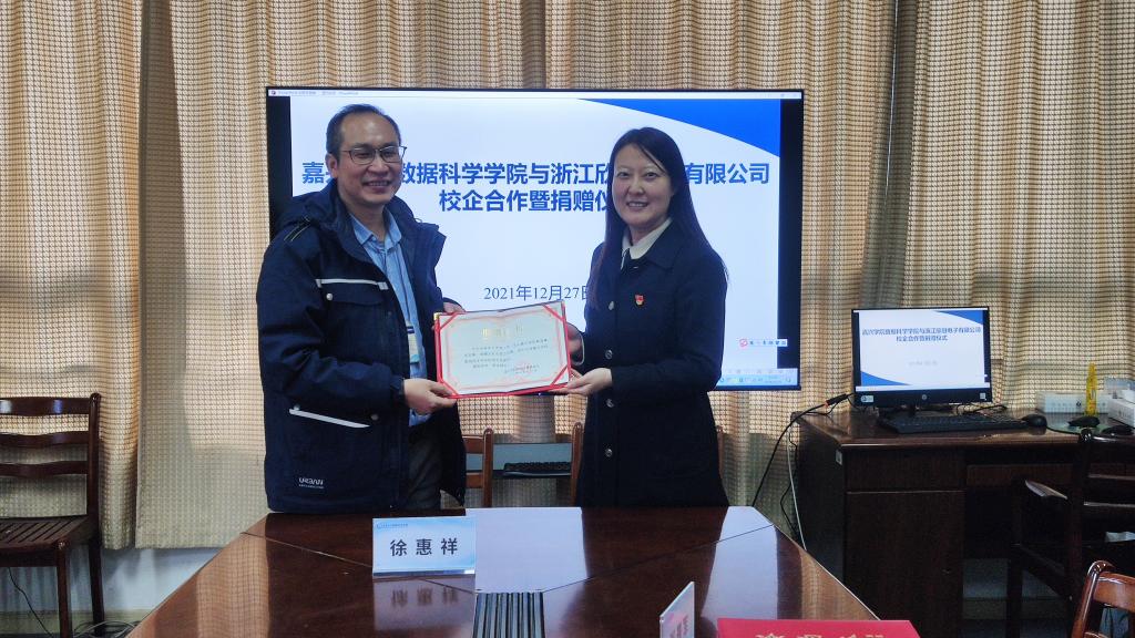 随后,张景军院长代表校教育发展基金会和徐惠祥总经理签订捐赠协议,战昕书记代表学校向徐惠祥总经理颁发捐赠证书。