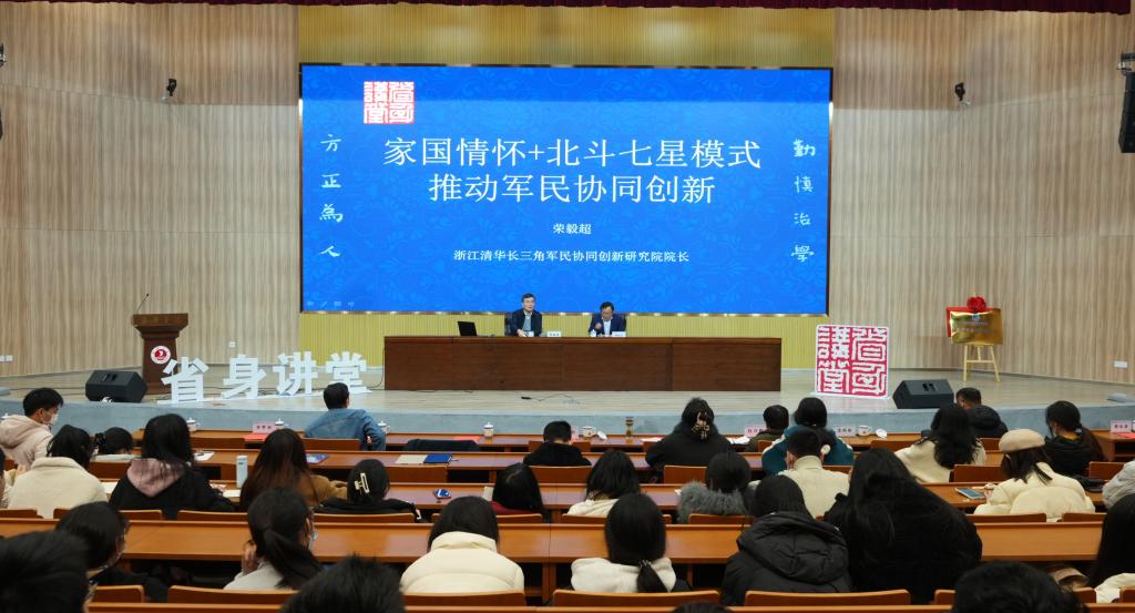 荣毅超院士从军民协同实践切入,介绍了浙江清华长三角军民协同创新研究院的基本情况和在研项目。他引用生动案例,重点讲述了研究院在深植家国情怀中坚持创新驱动、专业整合,持续探索军转民、助力地方经济发展,用军民协同之力破解“卡脖子”难题等的奋斗历程,并系统介绍了“政、产、学、研、金、介、用”七位一体“北斗七星”军民协同创新模式。荣毅超院士勉励广大师生将个人追求与祖国需要相结合,培养实事求是、求真务实和开拓创新的科学精神,自觉践行科技报国使命。