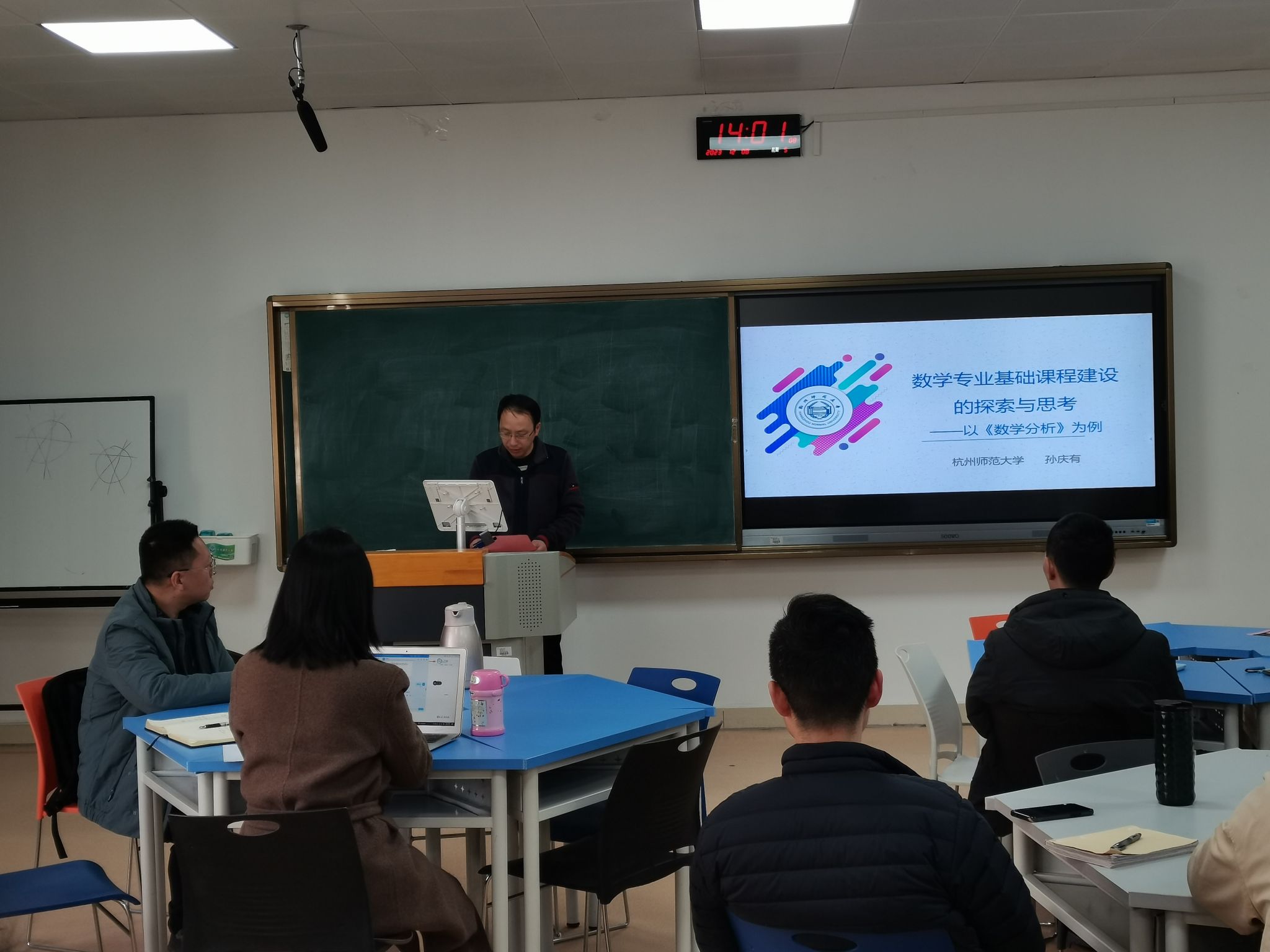 课程是学校育人的基础,是立德树人的“主战场”。数学专业基础课程的建设对数学专业人才培养起着重要作用。2023年12月8日下午,杭州师范大学数学学院院长助理、校青年博士联合会副理事长,“杭州市优秀教师”、杭州师范大学“教坛新秀”孙庆有副教授应邀来我校做数学专业基础课程建设报告。学院相关教师参加了报告会,会议由学院院长张景军教授主持。