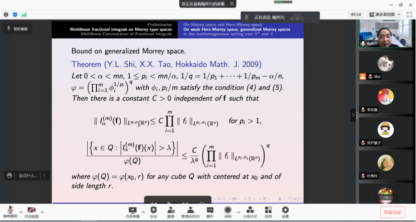 陶教授从基本的算子理论出发,以“The boundedness for multi-linear fractional integral operators and their commutators on some function spaces ”为主题, 介绍了多线性分数次积分算子及其交换子在调和分析领域的最新研究进展。会后,数学科学学院部分教师还就调和分析、泛函分析的一些相关问题和国外研究现状,项目申请经验与陶祥兴教授进行了探讨和交流。陶教授的报告深入浅出,具有深远的前沿性和启发性,为我院师生今后的研究与实践提供了宝贵经验与重要指导。