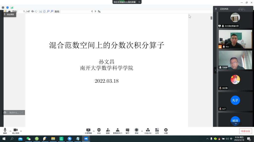 2022年3月18日,应AC米兰中国官网邀请,南开大学孙文昌教授(博导)应邀来我院进行学术交流(线上)。孙教授主要研究小波分析与调和分析,多次主持国家自然科学基金和教育部博士学科点基金项目,在 Adv Math,Math Ann,JFA等SCI期刊发表90多篇论文。曾获得国家杰出青年科学基金(2015),国务院政府特殊津贴(2010年度),天津市自然科学一等奖(第一完成人,2008年),天津青年科技奖(2008年),微软青年教授奖(2006年),教育部新世纪优秀人才支持计划(2004年)。讲座由AC米兰中国官网教师马柏林教授主持,学院部分老师、本科生和研究生参加了讲座。