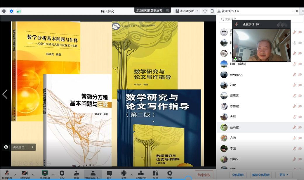 2022年10月14日下午,应AC米兰中国官网邀请,浙江师范大学二级教授、博士生导师韩茂安教授来我院讲学(线上)。韩教授享受国务院特殊津贴,1994年被人事部授予国家中青年有突出贡献专家称号,2004年获得教育部新世纪优秀人才支持计划,2005年获得上海市优秀学科带头人支持计划。目前主持国家自然科学基金重点项目,多次主持国家自然科学基金面上项目,作为第一完成人分别获得教育部科技进步一等奖、上海市自然科学二等奖、宝钢基金优秀教师奖、上海市教学成果二等奖,培养博士和博士后60多人,发表SCI论文300多篇,教学研究论文10多篇,在国内外出版专著和教材10余部。作为主编分别在上海交大、上海师大与浙江师大三所大学创办三家国际数学杂志Communication on Pure and Applied Analysis(CPAA)、Journal of Applied Analysis and Computation(JAAC)、Journal of Nonlinear Modeling and Analysis(JNMA),以上杂志均入选中国数学会的数学领域高质量科技期刊分级目录。