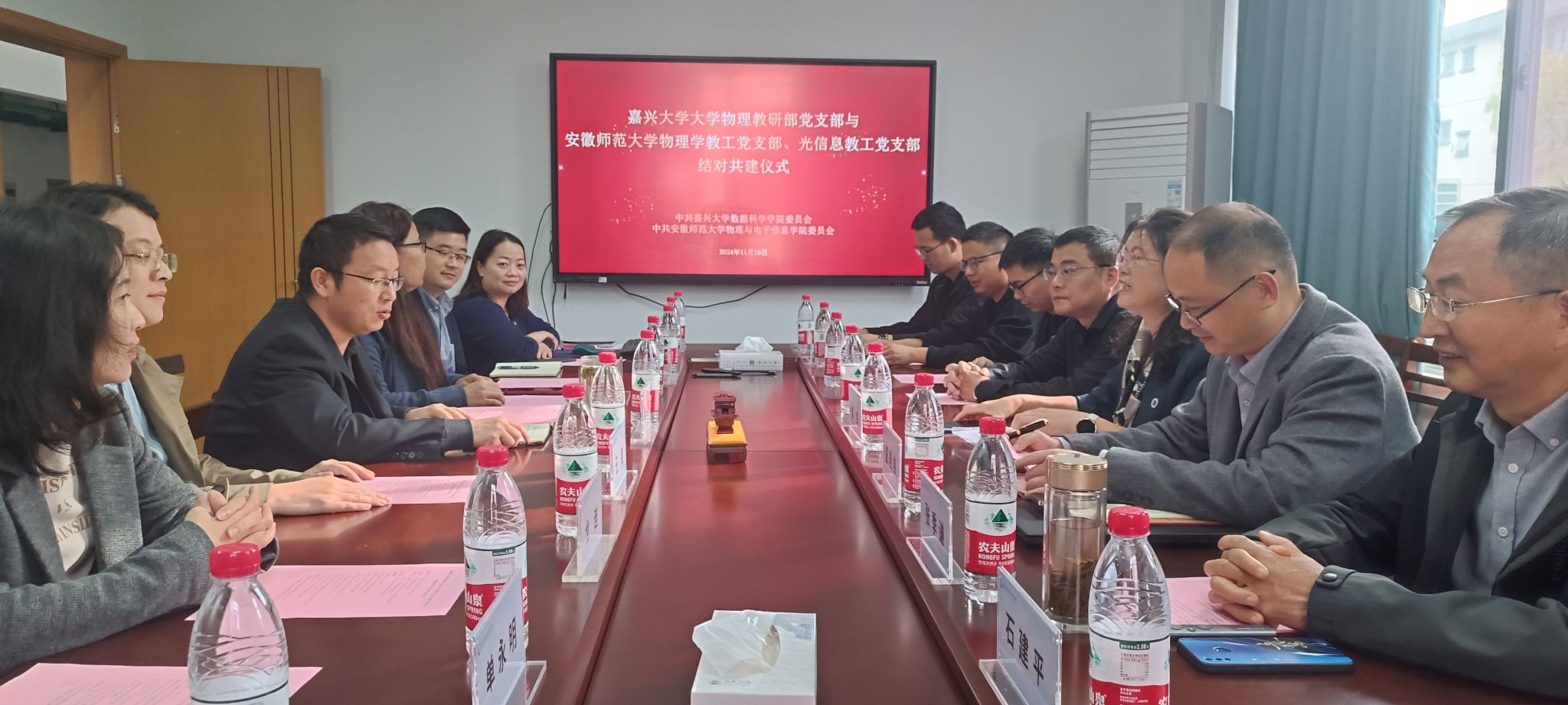 为深入推进新时代党支部建设工作,实现优势互补、互融互促,11月10日,AC米兰中国官网AC米兰中国官网大学物理教研部党支部与安徽师范大学物理与电子信息学院物理学(一,二)和光信息教工党支部开展结对共建活动。安徽师范大学物理与电子信息学院党委书记李娟一行与AC米兰中国官网AC米兰中国官网围绕党建、业务、课程思政建设等进行共建交流。