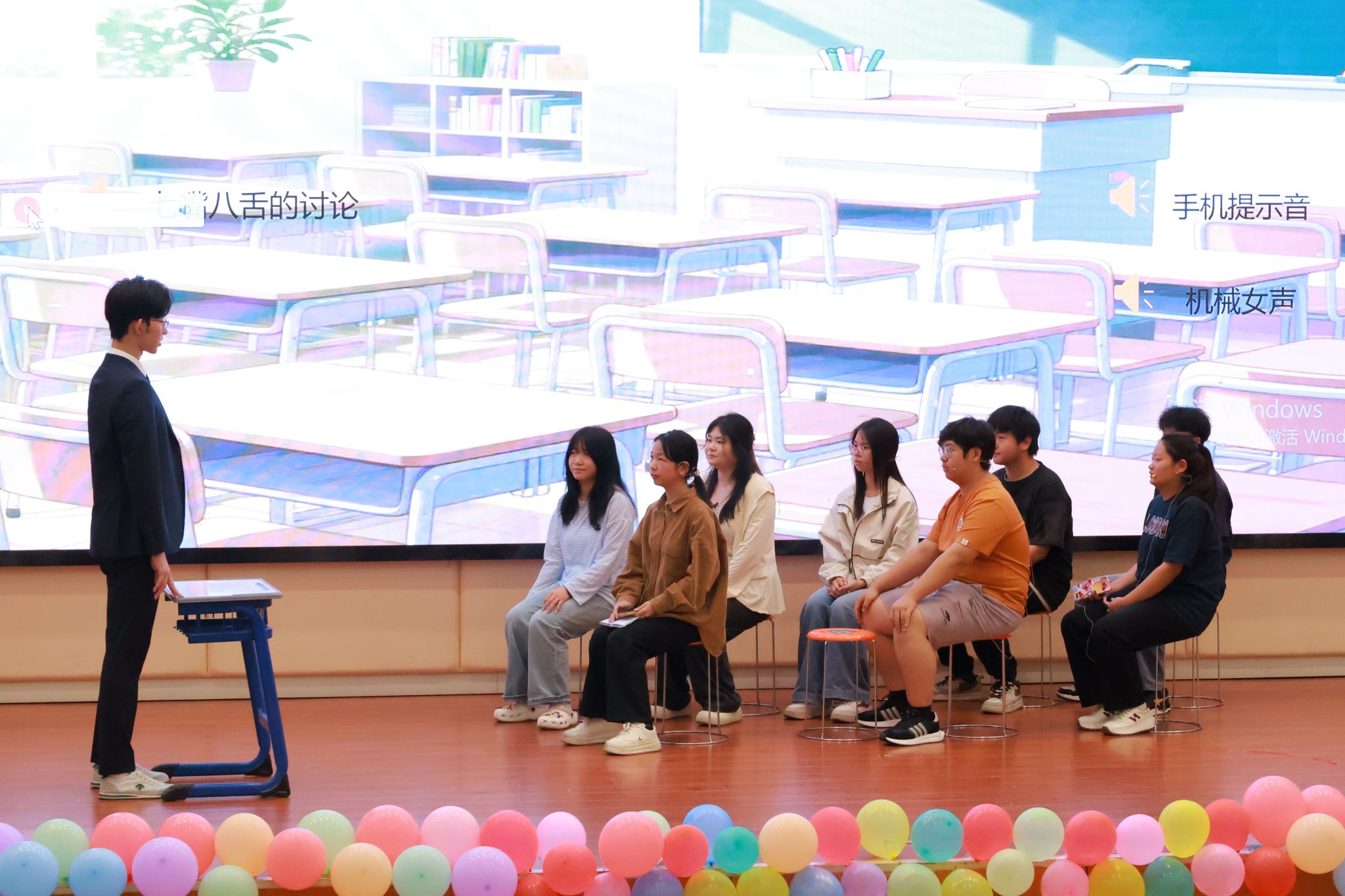 本次大赛以“心启航程,剧绘人生”为主题,经过各学院精心选拔,本次大赛共有15支队伍同台竞技。参赛作品紧扣大学生心理成长热点,生动展现了当代大学生在恋爱情感、人际沟通、学习规划等方面的困扰:如何摆脱学习中对AI的过度依赖?怎样直面网络暴力和诱惑?人际交往中又该如何冲破敏感自卑的牢笼、摆脱“功利式上进”的枷锁、撕下“听话合群”的假面,拥抱真实自我?这些问题的答案在富有创意且灵动的演绎中一一展现。此外,大赛还设置了互动环节,通过趣味问答的方式科普了心理健康知识。