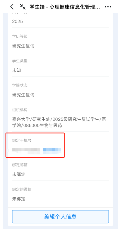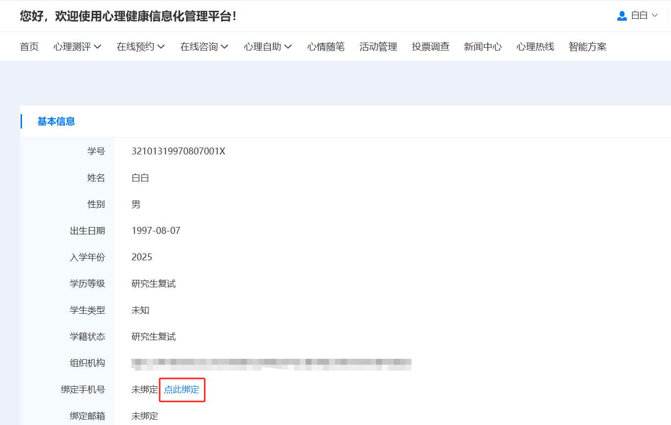 2.进入网页后,账号为身份证号,密码为出生日期(例:19900101)。输入验证码,点击“登录”后, 点击“我的”——“个人资料”,核对个人信息,并点击“绑定手机号”,进行个人信息绑定。